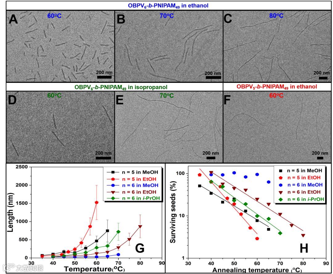 图2. OBPV6-b-PNIPAM49的种子胶束在乙醇中退火(A) 60°C、(B) 70°C和(C) 80°C以及在异丙醇中退火(D) 60°C和(E) 70°C时得到纳米纤维的TEM图;(F) OBPV5-b-PNIPAM49的种子胶束在60°C乙醇中退火时得到纳米纤维的TEM图;(G) OBPV5-b-PNIPAM49和OBPV6-b-PNIPAM49在不同溶剂中得到的纳米纤维的长度与温度诱导“自晶种”过程中退火温度的关系图;(H) OBPV5-b-PNIPAM49和OBPV6-b-PNIPAM49在不同溶剂中不同退火温度下幸存的种子胶束(surviving seeds)的浓度的对数与温度诱导“自晶种”过程中退火温度的关系图。