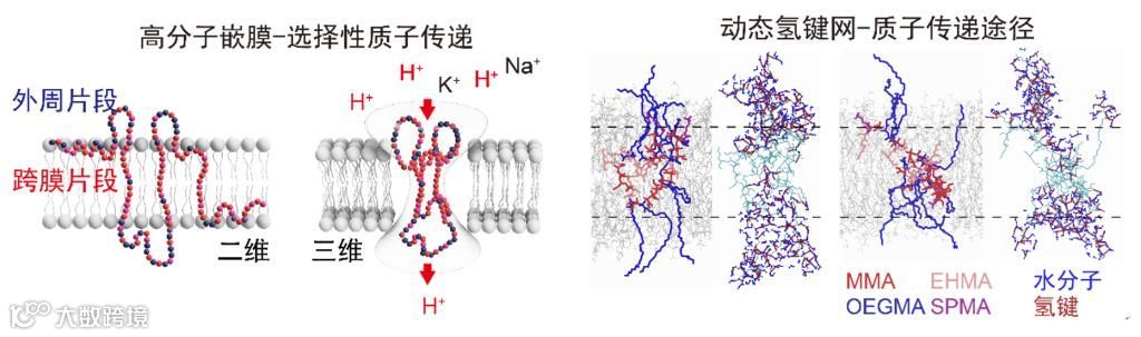 该工作提出了另一个研究思路,绕开复杂结构设计的难题,以离子跨膜传递的机理为设计基础,以跨膜质子通道为目标,设计了可自发嵌入磷脂双分子层的随机序列两亲高分子,在膜内形成了动态氢键网络作为质子跳跃传递途径。该高分子质子通道在传递速率和选择性方面皆达到接近A型流感M2质子通道的水平。这项工作也介绍了如何通过四种单体的RAFT聚合,调控具有随机序列和动态结构的高分子的整体化学性质,为关联高分子序列与功能方面的研究提供了一个有效的方法。