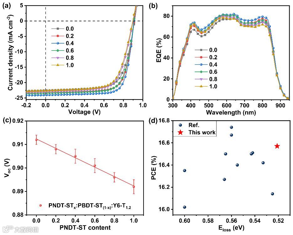 图3 (a)三元共混器件的J-V曲线;(b)三元共混器件的EQE曲线;(c)三元共混器件开路电压与组分比的关系;(d)文献报道超过16%的有机太阳能电池的能量损失对照图