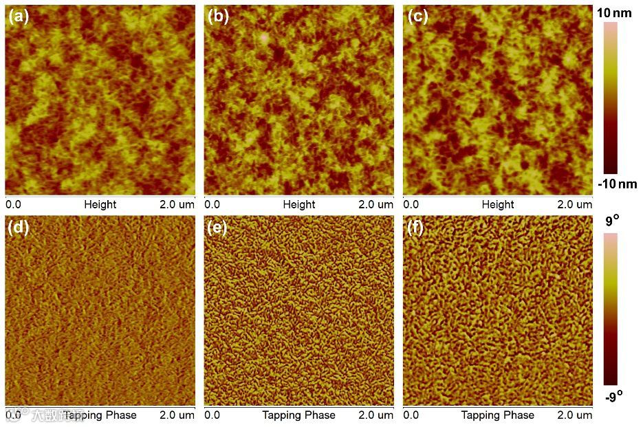 图5 (a-c)AFM高度图;(d-f)AFM相图;(a,d)PBDT-ST:Y6-T;(b,e)PNDT-ST:Y6-T;(c,f)PBDT-ST(1-x):PNDT-STx:Y6-T1.2