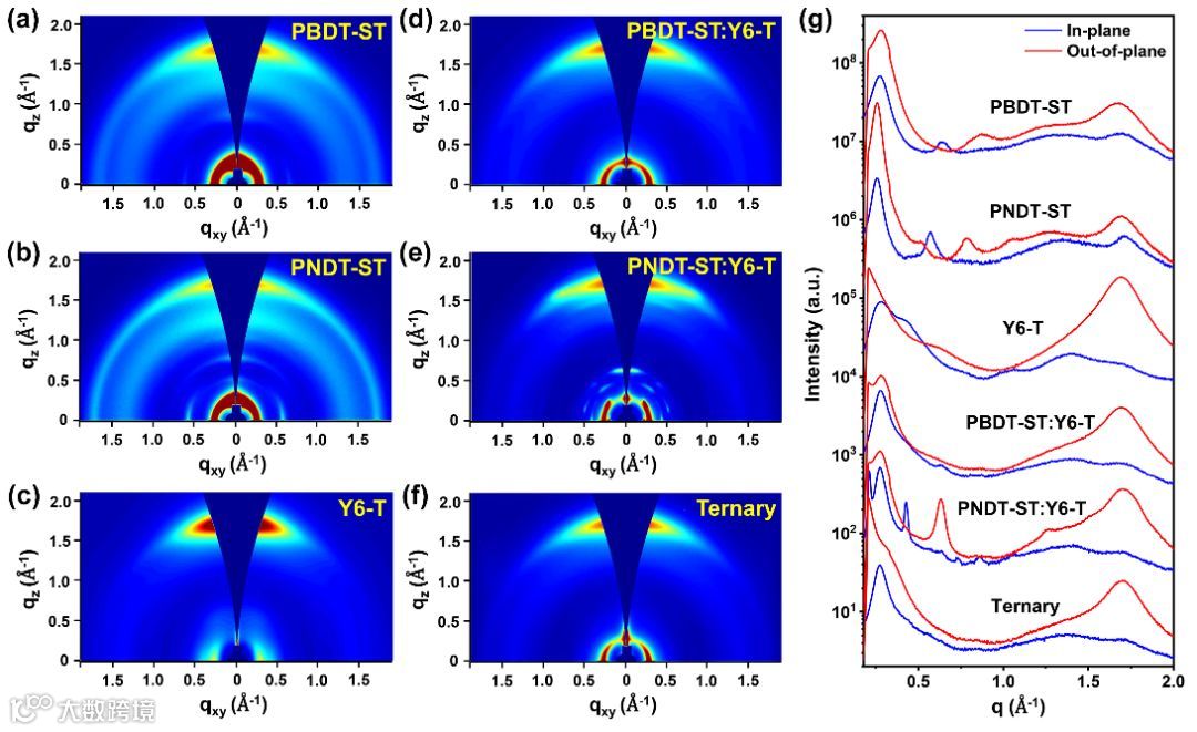 图4 (a-f)给受体材料纯膜以及共混膜的GIWAXS图;(g)GIWAXS在面内和面外方向上对应的曲线图