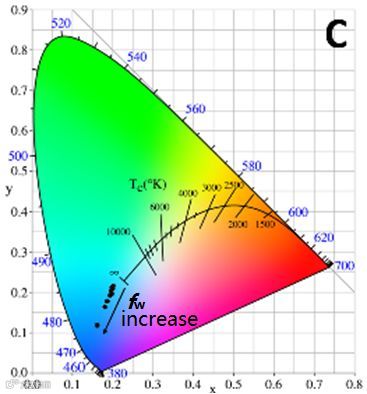 另外,超支化PCPMA聚合物也表现出了明显的聚集诱导发光(AIE)性质(图3)。随着含水量的提高,PCPMA在四氢呋喃溶液中开始聚集(A和D图),荧光明显增强,且荧光发射在CIE色度图中表现出了明显的蓝移(C图)。作为对比,线性PCPMA表现出了较弱的AIE活性,而小分子类似物甲基丙烯酸(4-乙腈基)苯酯(CPMA)和异丁酸(4-乙腈基)苯酯(CPB)则表现出了荧光淬灭(ACQ)现象(B图)。