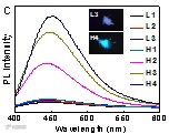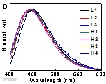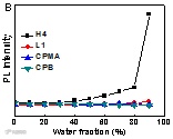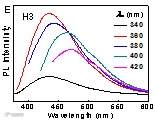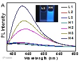 图2. 线性和超支化PCPMA聚合物的荧光行为(L1到L3,线性PCPMA,分子量升高;H1到H4,超支化PCPMA,支化度升高):A, B) 聚合物在稀溶液中的荧光发射;C, D) 聚合物在固相下的荧光发射;E, F) 聚合物荧光发射的激发波长依赖性