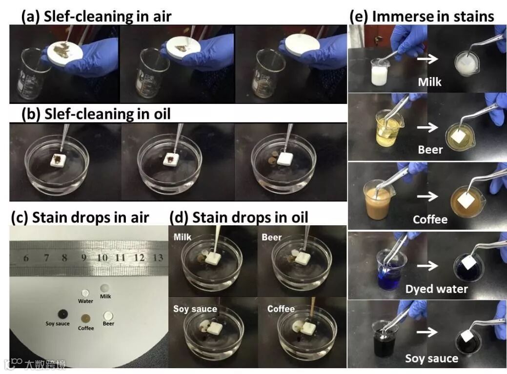 图4. (a)空气自清洁实验。灰尘微粒很容易被水滴带走;(b)油中自清洁实验。油中的灰尘颗粒(正庚烷)很容易被水滴带走;(c)球形染色液体立在材料的表面不会浸入,(d)试样浸渍在油中染色液体迅速弹开;(e)试样浸入染色液体取出后未被染色。