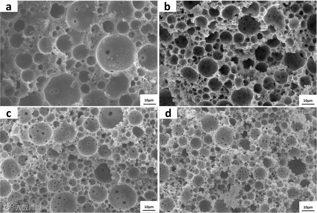 图2. 不同水油比试样的SEM图(a)1:1,(b)1:2,(c)1:3,(d)1:4