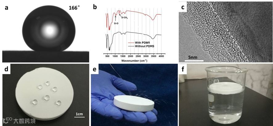 图3. (a)水接触角;(b)红外光谱;(c) TEM图像;(d)水接触试样时的状态;(e)水滴上试样迅速弹开;(f)轻质试样漂浮于水面照片。
