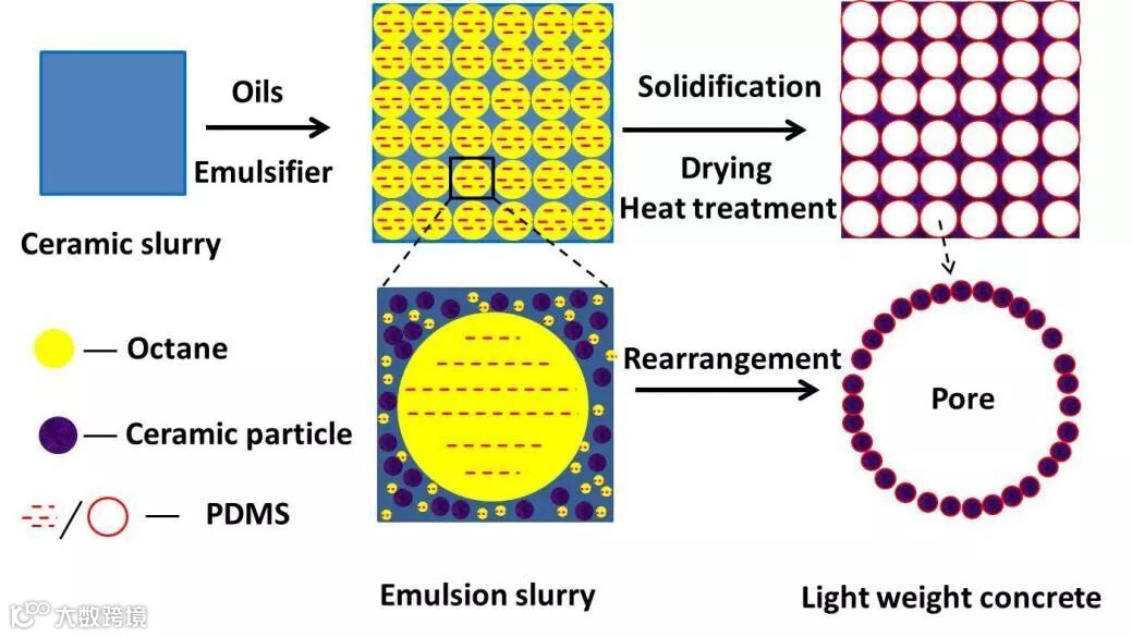 近期,中国科学技术大学的徐鑫教授课题组在制备混凝土时加入了油相、乳化剂和少量的聚二甲基硅氧烷(PDMS),制备均匀疏水修饰的3D轻质混凝土块体。在乳化剂的帮助下,形成许多含有PDMS的微小油滴。随后对混凝土进行干燥和加热,实现了PDMS对孔隙和陶瓷粉体的均匀修饰。通过调节油水比例,可大范围调整试样的孔隙率、抗折强度、体积密度。由于所得多孔混凝土的气孔尺寸只有30微米左右,远小于市售泡沫混凝土的1mm,因此其虽重量轻,但机械强度强。