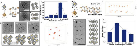 实验结果表明,不同维度上的多种团簇结构均能够按照预期形成,同时展现出可观的装配精准性和产率。在透射电镜(TEM)和扫描电镜(SEM)下不仅观察到了不同结构的组装产物,更论证了该编码策略的可靠性。在表征过程当中,研究人员还与上海光源、国家蛋白质科学中心以及南京大学亚原子分辨中心的相关专家展开合作,借助X-射线小角散射(SAXS)、冷冻电镜(Cryo-EM)以及三维重构(3D-reconstruction)等多种技术手断多角度展现了胶体纳米粒子在不同结构中的排列方式和真实状态。