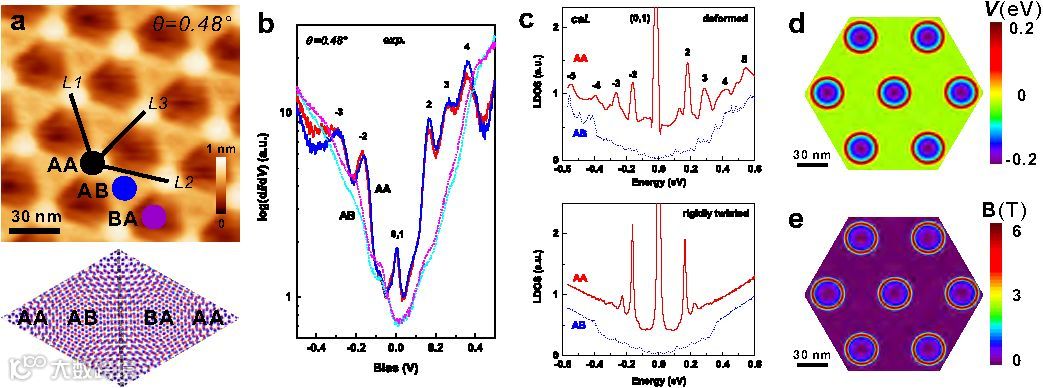 图:小角度双层石墨烯中本征赝磁场的发现。对于转角为0.48度的双层石墨烯,在不加外磁场情况下,实验发现了贋朗道能级(图b),理论计算进一步验证了这种贋磁场行为(图c),并估算出贋磁场值大约为6特斯拉(图e)。