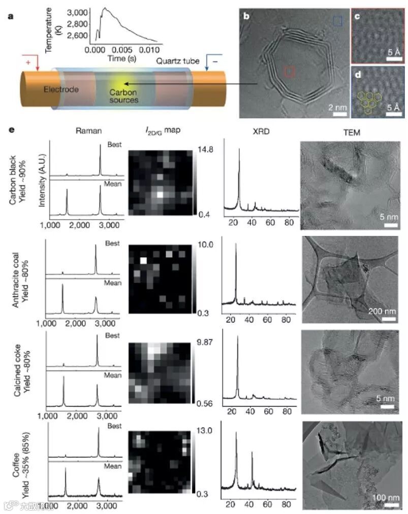 将材料放在两个电极之间,并用短脉冲发射加热材料,同时破坏其化学键。从而使非碳元素消失,而其余碳原子转化为石墨烯。这从本质上加快了碳演化成石墨基态的缓慢的转化过程。由于热尖峰而大大加速,材料在石墨烯阶段的适当时刻停止了。