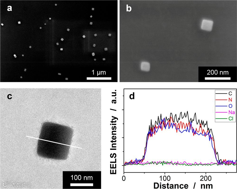图1. (a)SEM(b,c)TEM图显示冻干后PNIPAM微凝胶呈立方体状,(d)EELS谱确认该微凝胶主要含C/N/O元素