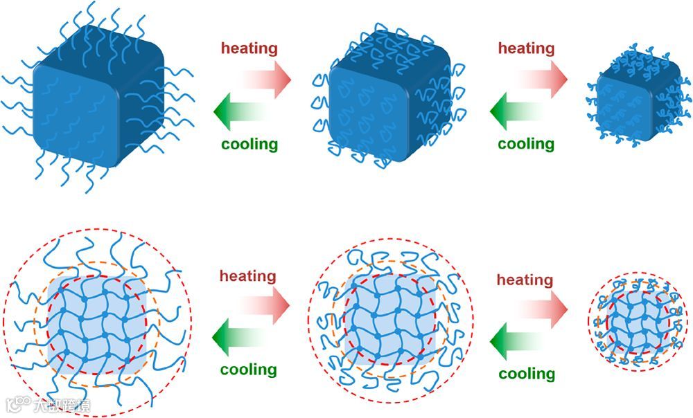 图2. 立方体状PNIPAM微凝胶的温度响应体积相转变示意图