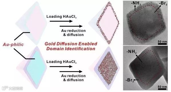 该工作首先选取了一系列具有核壳结构的层状MOFs,并将氯金酸(HAuCl4)灌入MOFs孔道内。随后,MOFs孔道内的Au(III)在200℃氢气氛围下被还原为金纳米颗粒(Au NPs)并在MOFs的孔道之间自由扩散。由于不同官能团域对于Au NPs的表面有着不同的亲和力,Au NPs能够选择性地在“亲金”(Au-philic)的官能团域内进行结晶生长。得益于还原后的Au NPs的高衬度,层状MOFs的官能团域边界能在透射电子显微镜(TEM)下清晰地被勾勒出来。因此该方法被称之为Gold Diffusion Enabled Domain Identification(GDEDI)。GDEDI法在用来确定壳核MOF官能团域边界时能获得高达±1.5 nm的空间分辨率。甚至对于传统方法无法表征的一类壳核MOF: UiO-66-NH2@UiO-66-NO2,该方法依然可以实现对官能团域进行准确识别。本工作为研究具有复杂官能团域分布的MOFs材料(例如MTV-MOF、层状MOFs和渐变MOFs等)提供了新思路。