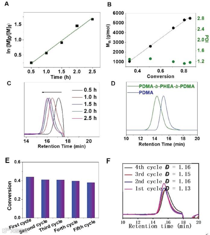 图2. A)ln([M]0/[M]t)随反应时间变化的曲线。B)Mn,GPC和Đ与单体转化率的关系。C)不同光照时间条件下所得聚合物的GPC曲线。D)链扩展前后的聚合物GPC曲线。E)单体转化率随PDPB-NF6循环次数的变化。F)PDMA的GPC曲线。