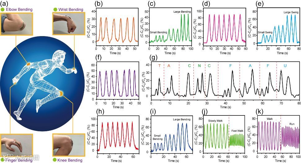 图4. 基于PB-Ag/TA@CNC水凝胶的电容传感器用于监测人体运动。(a)监测位置概述。(b)特定角度手指弯曲过程的电容信号。(c)手指不同弯曲角度过程的电容变化。(d)肘关节弯曲过程的电容信号。(e)肘部不同幅度摆动过程的电容信号。(f)手腕弯曲过程的电容信号。(g)英文字母书写过程手腕的电容信号。(h)膝关节弯曲过程的电容信号。(i)不同角度膝关节弯曲过程的电容信号。(j)不同频率行走过程膝关节的电容信号。(k)步行和跑步过程膝关节的电容信号。