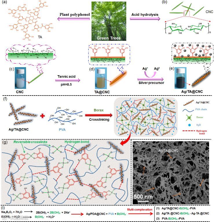 图1.(a,b)TA和CNC的化学结构,(c-e)功能性纳米纤维素(Ag/TA@CNC)合成示意图。(f)PB-Ag/TA@CNC纳米复合水凝胶的构建示意图。(g)PB-Ag/TA@CNC水凝胶中动态硼酸酯键和氢键结合示意图。(h)PB-Ag/TA@CNC水凝胶的微观结构(Ag/TA@CNC=4.0 wt%)。(i)Ag/TA@CNC、PVA和硼砂之间的多种结合方式。