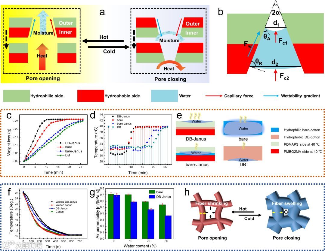 图3. 双面协同智能Janus织物的单向导湿机理(a-b)和温度自适应控湿调温效果(c-e为高温效果,f-h为低温效果)。