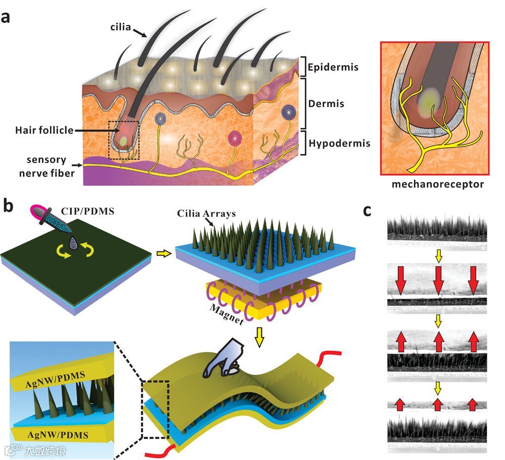 图1(a)人类皮肤的组成和毛发感应机制示意图。(b)电容式压力传感器制备过程。(c)纤毛阵列在外压力下的恢复情况展示。