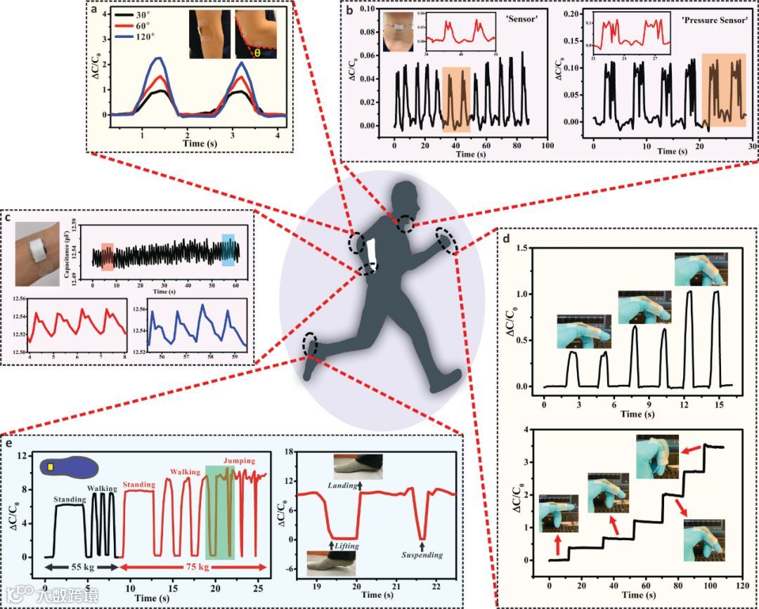 图3 (a)肘关节弯曲监测。(b)声音监测。(c)脉搏监测。(d)指关节弯曲监测。(e)运动监测。比如站立、走路、跳跃。