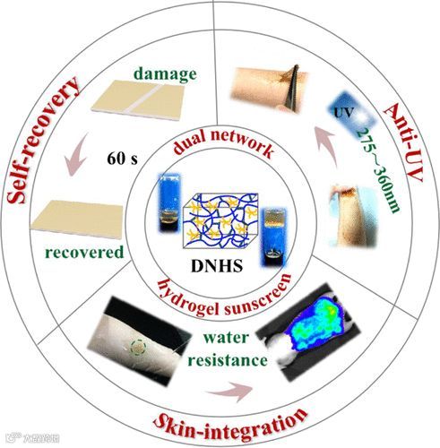 众所周知,传统防晒产品存在着无机(有机)紫外过滤剂穿透皮肤表面,在人体细胞中产生潜在的生物毒性可能。于是,一种既能实现高效抗紫外功能,又能保证产品生物安全性的水凝胶粘合剂成为业界研究的趋势。“如何使水凝胶有效封装抗紫外因子,且使其在人体皮肤表面出汗及动态生理环境变化下,保证材料结构和功能的稳定性是研究的关键。”论文第一作者王瑞副教授介绍,“课题组采用的自主研发且已实现产业化的产品γ-聚谷氨酸为原料,研发出的新型水凝胶防晒剂有效解决了这两个瓶颈问题。”
