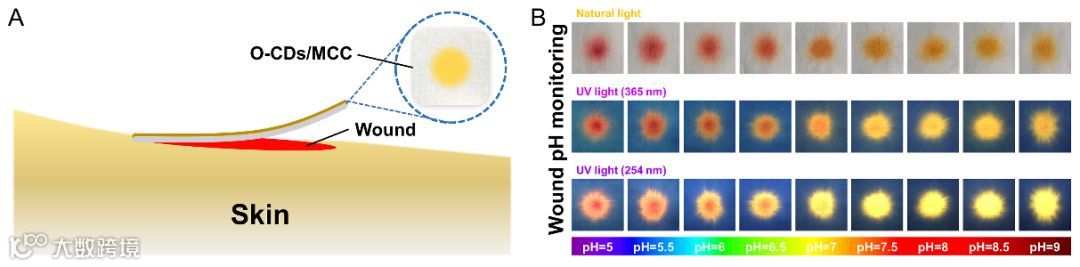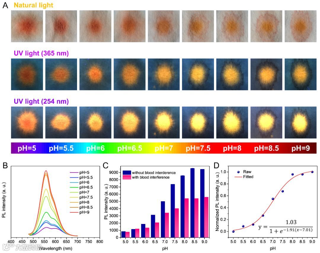 南京林业大学周晓燕教授课题组成员以1,2,4-三氨基苯和尿素作为前驱体,通过快速微波辅助水热法制备得到了具有橙色荧光发射的碳量子点。研究发现,在pH为5–9的范围内,该碳量子点表现出优异的pH依赖性荧光比色双重响应特性,即随着碳量子点溶液pH值的增加,紫光灯下的荧光强度逐渐增强,同时,碳量子点溶液在自然光下的颜色由红色逐渐转变为黄色。基于这一独特的光学性能,该碳量子点能够作为一种潜在的伤口pH检测探针。考虑到碳量子点溶液本身不利于实际应用,课题组成员巧妙地将合成得到橙色荧光碳量子点水溶液直接滴涂在医用棉布上,结果发现,由于碳量子点与棉纤维之间的氢键作用,负载碳量子点的棉布不仅具有优异的抗流失性,同时表现出增强的黄色荧光发射现象。体外实验表明,当模拟伤口的pH值由5增加至9时,该荧光复合材料表现出比碳量子点溶液本身更加显著的比色荧光双重响应特性。此外,碳量子点与棉纤维复合后测得的归一化荧光强度与pH值之间存在良好的非线性相关性,为此建立的简易数学模型能够实现pH的定量检测。为了更加贴近实际应用,研究证实这种可视化的pH探针具有较低的生物毒性,优异的抗药物干扰性,耐浸出性以及循环稳定性等。实验重点考察了该pH探针在血液干扰和长期贮存后的可靠性和灵敏度,发现比色与荧光的双重响应性不仅能够保证pH探针在应用过程中良好的抗干扰能力和优异的稳定性,而且根据建立的数学模型可以实现pH值的准确预测,显示出其作为伤口pH探针的巨大应用潜力。