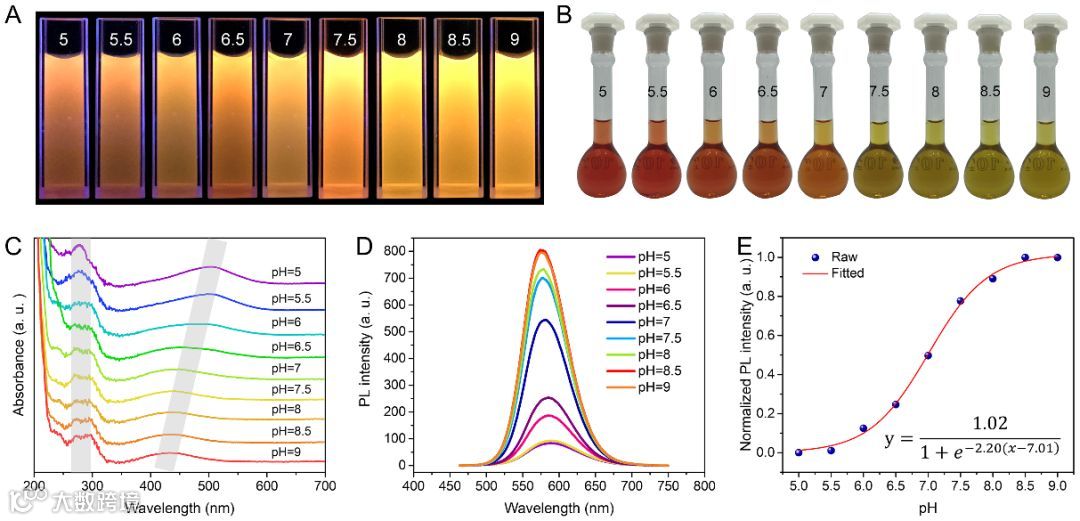 图2 橙色荧光碳量子点pH依赖性的比色与荧光响应行为。