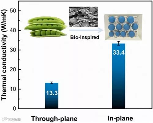 除此之外,研究还发现在石墨烯抽滤过程中引入微米尺度的球形氧化铝颗粒,可以使得石墨烯片取向由水平方向部分转变为纵向方向,得到具有类似“豌豆荚”的结构。这类仿“豌豆荚”结构的二元石墨烯-氧化铝填料可有效增强聚合物材料的导热性能,该方法制备的环氧复合材料纵向和横向的导热系数分别可达到13.3W/mK和33.4W/mK(如图2所示),相关工作将发表在化工领域的核心期刊(Chem. Eng. J., 2020, 381, 122690),开发的高导热环氧复合材料有望代替传统的聚合物材料解决目前高度集成的电子设备的散热问题。