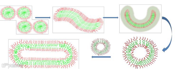 该模拟工作聚焦于一个具体的实验体系,即三硫代碳酸化的聚丙烯酸(PAA)作为大分子链转移剂,与苯乙烯单体(St)在甲醇溶液中聚合生成PAA-b-PS嵌段共聚物的聚合诱导自组装过程,对其形貌及自组装的热力学和动力学机理进行了深入探讨(如图1所示)。该模拟研究基于吉林大学吕中元课题组开发的GPU加速GALAMOST模拟程序包和描述链增长反应的SKIPS-GALAMOST模拟平台而展开。模拟研究首先证明该聚合反应遵循一级反应动力学,因此模拟所重现的链增长过程中疏溶剂嵌段的分子量及其分布是客观且正确的。模拟研究显示,作为一个典型的非平衡态自组装过程,PISA展示出了清晰的动力学转变路径,即从反应初期分散的小胶束到融合为蠕虫状胶束,再转变到中间态的层状胶束的过程;层状胶束的自发弯曲进而形成闭合的囊泡结构;相邻的囊泡结构在接下来的演化过程中进一步融合,最终形成较大的柱状囊泡。其动力学演化如图2所示。