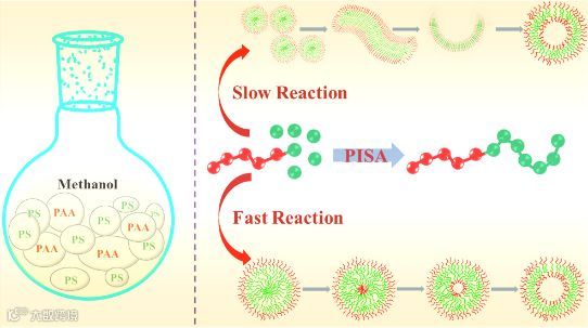 图1. 聚合诱导自组装示意图。模拟研究表明不同链增长速率下的PISA遵循不同的动力学转变路径。