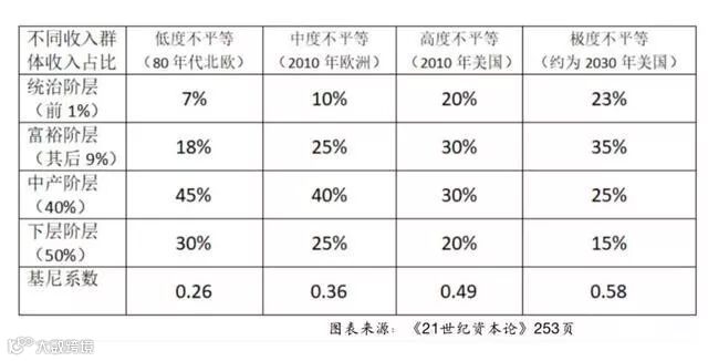 皮凯蒂也分析了基尼系数的发展趋势。数据显示了资本主义社会分化的不断加剧,教育民主化并没有消除社会不平等。最上层1%的群体足以对整个社会面貌和政治经济秩序产生重大影响。这个超级财富阶层必然有他们自己的教育选择,因为他们需要通过教育将其财富体面地传递到下一代。