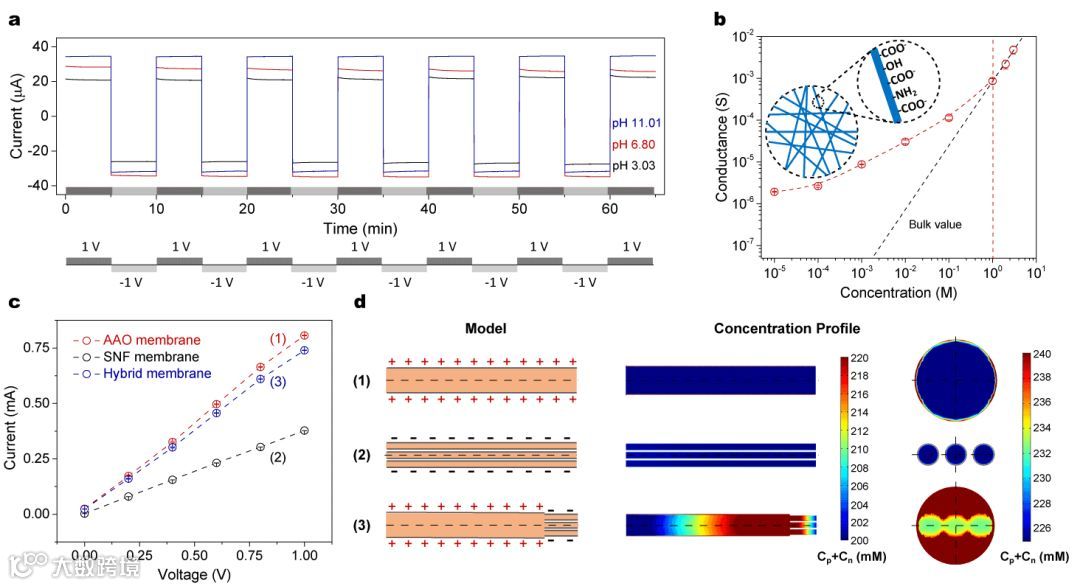 此外,实验结果表明,这种具有孔道结构、化学组成和表面电势非对称的复合膜能够促进有效促进离子的输运。该膜在较宽的pH值范围内具有较宽的工作环境,特别是在碱性溶液,复合膜展现出优异的能量转换性能,这为将复合膜应用于工业废水中能量的提取奠定基础。值得注意的是,得益于β折叠在蚕丝蛋白的丰富含量以及复合膜之间的氢键作用,该膜材料表现了长时间稳定性,这也为实际应用奠定了基础。
