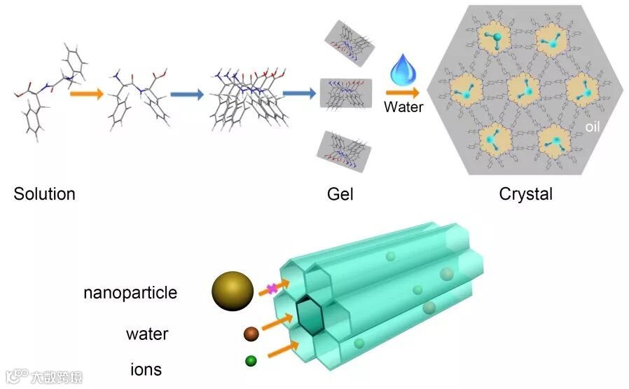 最近,该课题组与德国马普高分子研究所教授George Fytas合作,发现苯丙氨酸二肽在甲苯中能迅速组装成高稳定性的有机凝胶,痕量水的引入能诱导该有机凝胶转变成晶体结构。通过动态光散射技术,监测到了组装体系相变过程中短肽分子构型变化而导致的凝胶形成。相变后形成的短肽晶体纤维介导了水在有机凝胶中的各向异性输送,其中阴离子对水传输速率的影响表现出Hofmeister效应。纳晶纤维中通道的尺寸限制导致量子点或纳米颗粒无法随水或离子一起输运,使得水溶液中的离子与纳米颗粒分离。该组装体系的建立为痕量纳米颗粒的自动分离(无需外界压力驱动)提供了新途径。相关研究成果近期发表在Angew. Chem. Int. Ed., 2019, 58, 11072-11077。共同通讯作者为李峻柏、费进波和George Fytas,共同第一作者是博士毕业生袁婷婷和许有前。