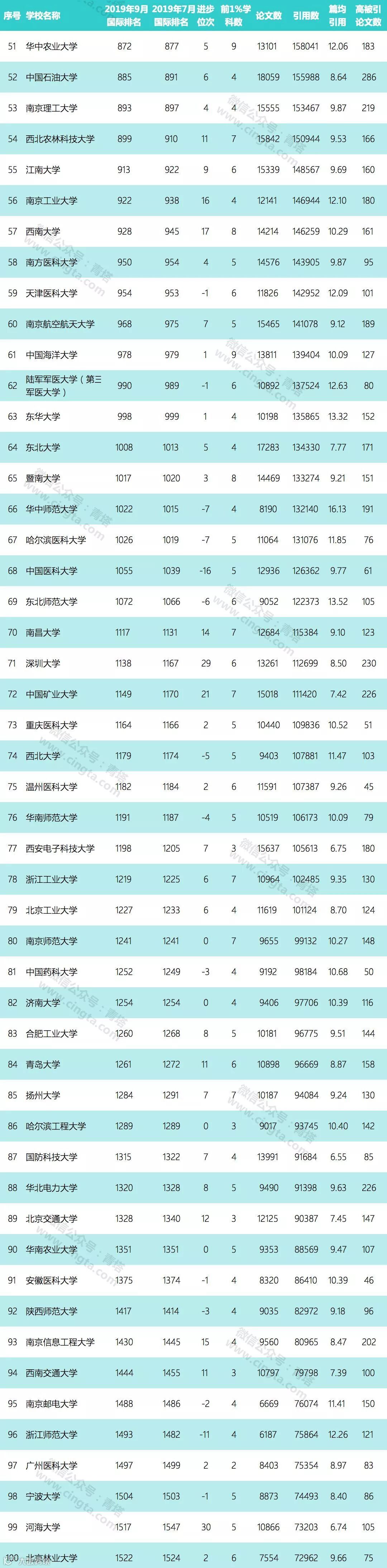 从统计数据来看,本期(2019年9月)百强高校ESI综合排名相比上一期(2019年7月)有一定幅度进步。