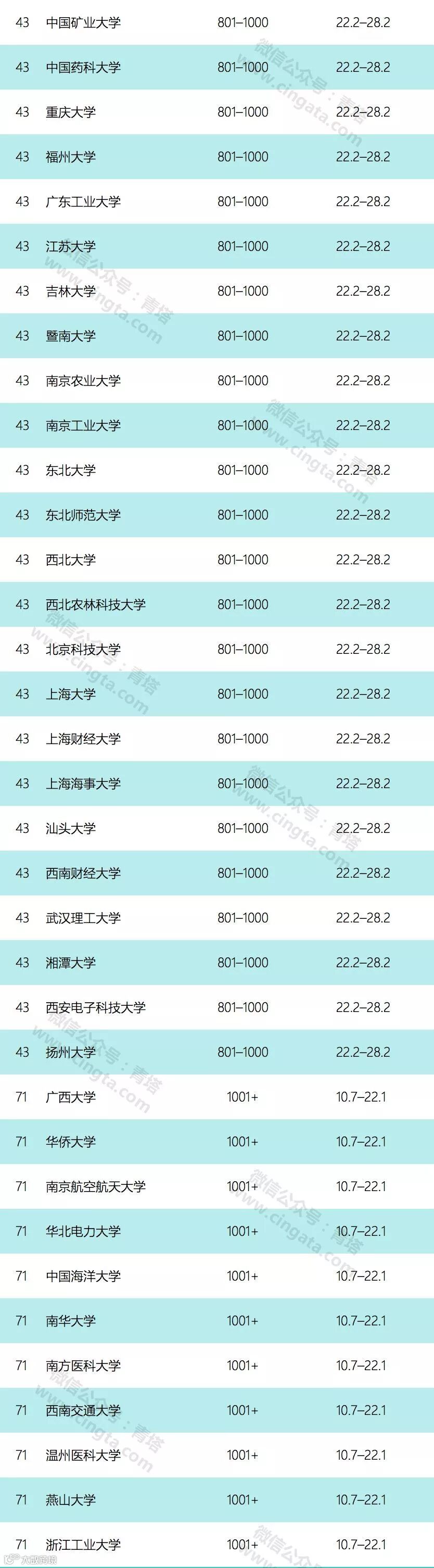 中国内地今年有10所大学新加入排名。其中表现最好的是北京师范大学, 排名位于301—350区间。其他六所新上榜的中国内地高校也进入了前1000名,分别是电子科技大学、对外经济贸易大学、江苏师范大学、广东工业大学、上海财经大学、西南财经大学,其余三所的排名则位于1000名之后,分别是南京航空航天大学、温州医科大学、浙江工业大学。