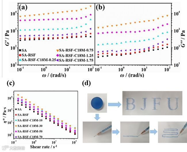 图2. HA凝胶的(a)储能模量(G’)和(b)损耗模量(G”)。(c) SA,SA-RSF与不同浓度的C18M 的SA-RSF-C18M HA凝胶的稳态剪切粘度η* (37°C)。(d) HA凝胶的可注射性(甲基蓝染色)。