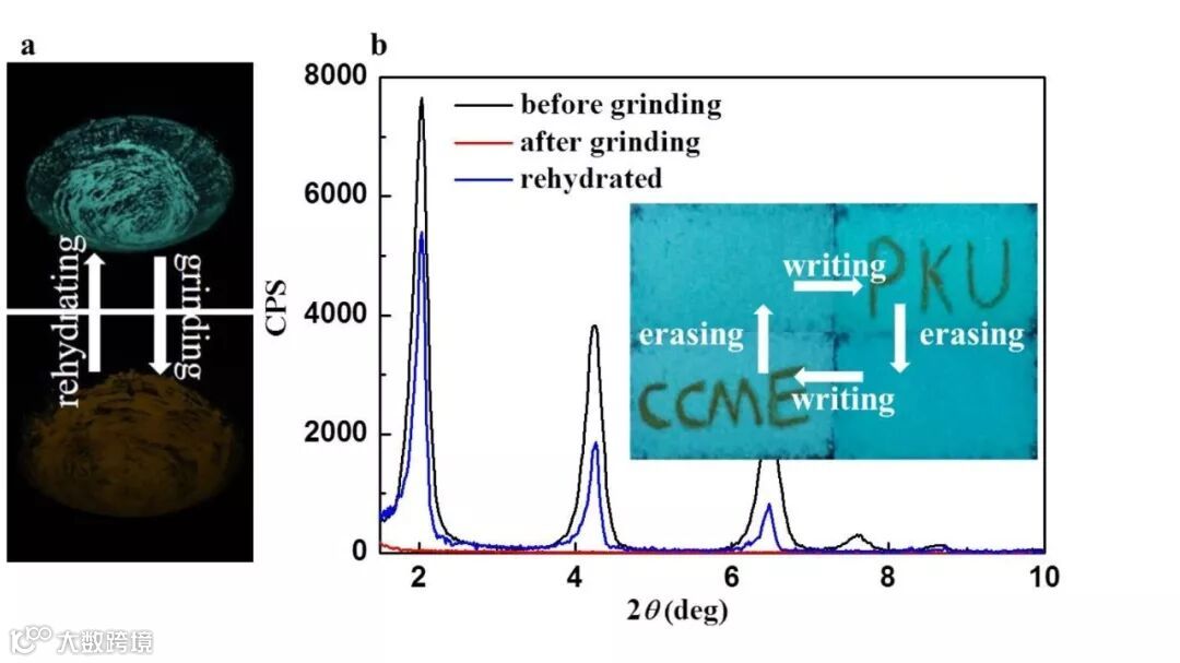 图5. 基于PBFL-Mg体系的可逆冷擦写材料。a) 研磨引起PBFL-Mg体系的荧光发射由蓝变黄,溶剂熏蒸使荧光恢复;b) 研磨前后及研磨后重新水化的X-射线衍射图谱的变化。插图表示用玻璃棒在蓝色荧光基底上可逆“冷写”的实验结果。