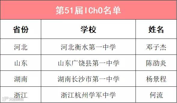 在本届IChO中,何流同学、邓子杰同学、杨景程同学获得金牌,陈劭炎同学获得银牌。其中来自浙江杭州学军中学的何流同学荣获个人总分第一、实验第一;来自河北衡水第一中学的邓子杰同学荣获个人总分第二,理论第一!