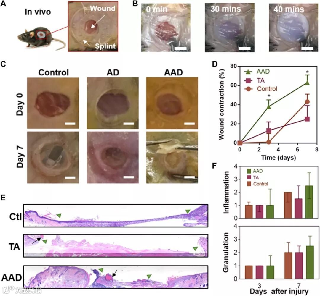 在实验室测试中,研究人员发现AAD粘附在猪皮上的力量是创可贴的10倍。它还使小鼠的伤口面积减少了约45%,而对照组未经治疗的伤口在同一时期几乎没有减少。此外,它比其他测试的实验性愈合水凝胶能更快地使伤口愈合,并且它不产生炎症或免疫反应。