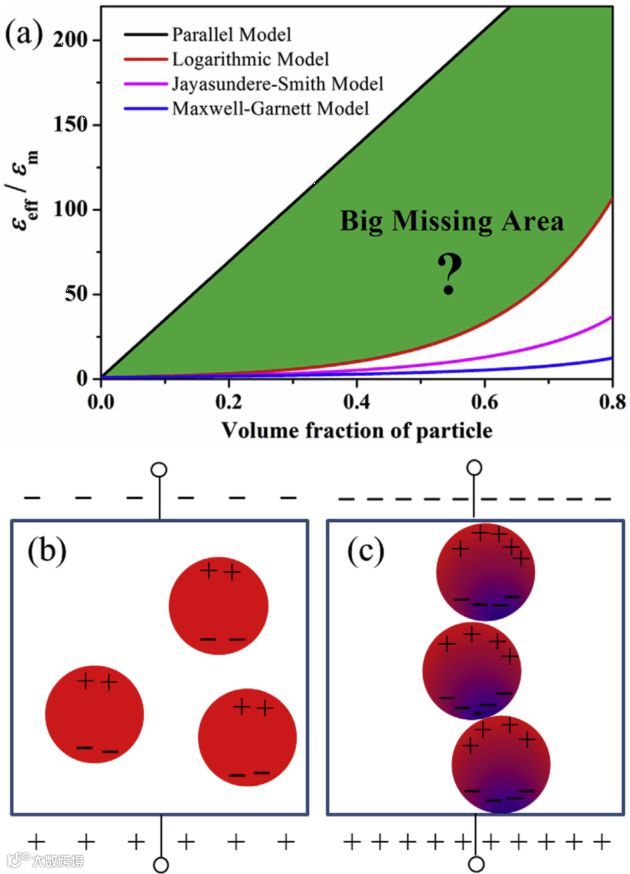 图1 (a)不同理论模型介电常数与粒子体积分数的关系;(b)粒子是离散的;(c)粒子形成网络。