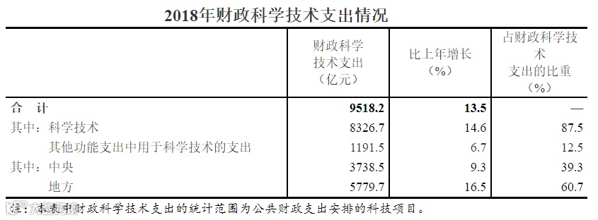 2018年,国家财政科学技术支出9518.2亿元,比上年增加1134.6亿元,增长13.5%;财政科学技术支出与当年国家财政支出之比为4.31%,比上年提高0.18个百分点。其中,中央财政科学技术支出3738.5亿元,增长9.3%,占财政科学技术支出的比重为39.3%;地方财政科学技术支出5779.7亿元,增长16.5%,占比为60.7%。