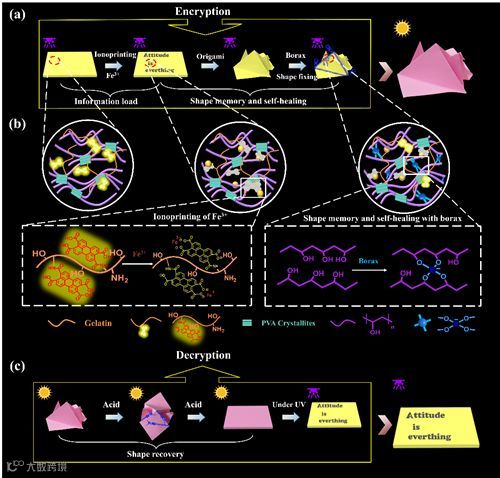 图5 (a-c)将分别负载“UCAS”、 “Q1A2Z3”、“Attitude is everything” 等信息的2D荧光水凝胶片手动折叠成各种三维形状后置于硼砂水溶液中,10s至3min后就可以得到形状各异的3D水凝胶信息载体。相较于经典的二维信息加密策略,这种加密于三维空间的信息的安全性更高,因为其负载信息只有在先置于酸溶液中恢复2D形状后才能在紫外灯下观察到(Adv. Funct. Mater. 2019, DOI: 10.1002/adfm.201905514)