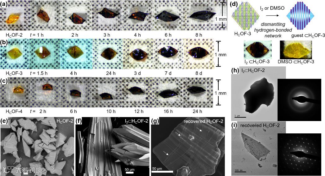 图3,HcOFs-2-4吸附碘后的形貌动态跟踪图(a-c),HcOFs-3晶体在DMSO和碘液中的溶胀裂纹褶皱图(d)以及HcOFs-2吸附碘前后和释放碘后的SEM和TEM图。图片来源:JACS.