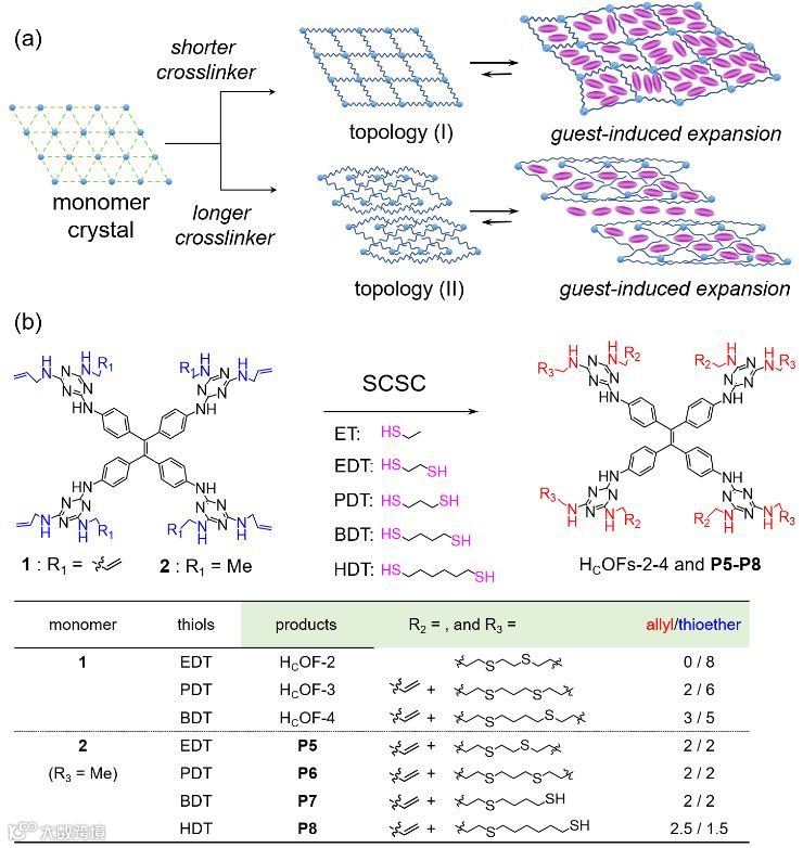 图1,多位点四苯乙烯基双功能单体1和2分别于不同尺寸的二硫醇连接子晶态拓扑共价交联策略(a)和合成路径图(b)。图片来源:JACS.