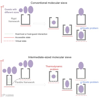 将传统分离纯化技术如蒸馏改为基于多孔材料的吸附分离有望大大降低能耗。分子筛(molecular sieve)具有分子级均匀孔径,可以只让小于孔径的分子通过,可以达到理想的吸附选择性。但是,当混合物中存在多种尺寸各异的成分,而且提纯目标不是尺寸最小的成分时,分子筛的效果就会大打折扣。例如,苯乙烯的尺寸介于乙苯和苯/甲苯之间,用分子筛无法通过一次吸附获得高纯苯乙烯。