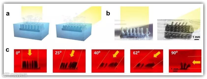 向光性的意义在于,无论光来自于何处,都能够让材料自身更大程度的捕获入射光源。基于这一思路,作者将这一向光原理应用于太阳光水蒸发器去改善其本质的光捕获问题。近年来,太阳光水蒸发器由于其成本低廉,能量转化效率高而引起人们广泛关注。很多文章中有报道蒸水膜在室外的工作性能,不乏看到蒸水速率通常早晨偏低,中午到下午时达到了一个峰值而晚上又会下降。由此可以知道入射角度对光强和蒸水效率有很大的影响。对此团队用这种向光材料设计成了水凝胶柱阵列,每个柱子初始竖直排列,顶部处在水-空气界面。当光从斜角度入射时,每个水凝胶柱能自动偏向光源,捕获能源,补偿斜角度光功率密度损失的问题。这种具有追踪光源行为的水凝胶柱阵列在斜角度入射60度时仍能维持90%垂直情况的蒸水效率,而控制组只有50%。并且蒸水效率不随水平旋转角而变化,保持稳定状态。这些都证实了向光性在能量捕获上的可行性应用。