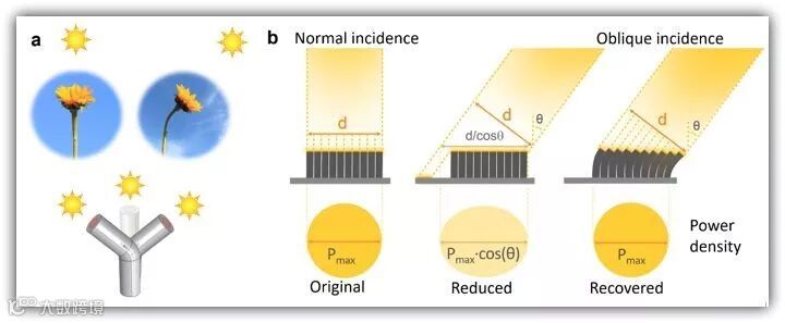 向日葵是一个非常有趣的植物,幼年的向日葵白天会紧跟太阳的方向。这样做的原因是花盘能收集更高的光功率密度(power density),升高温度,吸引昆虫传播花粉(Science, 2016.353(6299), 587)。于是,本文作者借鉴了向日葵等植物向光捕捉能量的策略,设计了一种智能的向光材料,其表面可以实时自动转向光源,从而在不同角度上仍能捕获到具有几乎相同强度的光,从原理上弥补斜角度能量密度损失(OEL)的问题 (图1b)。
