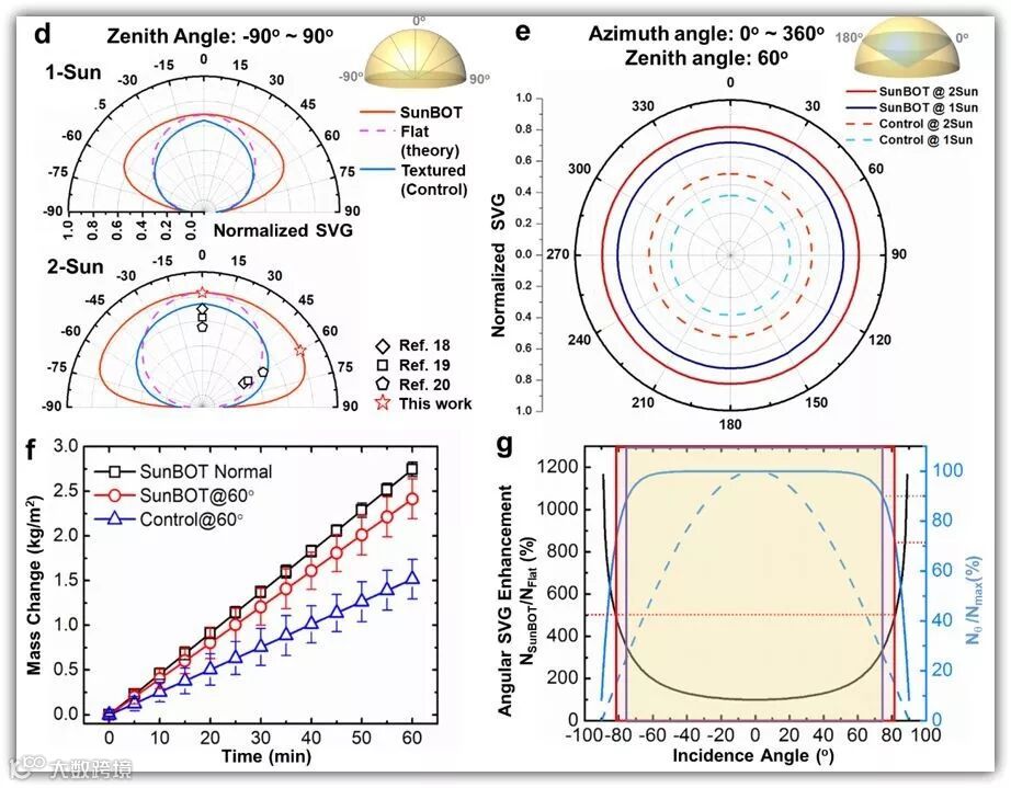 ▲图4. 人工向光性用于增强太阳能水蒸发器。 (a,b,c)向光太阳能水蒸发器示意图,实图和在不同入射光下蒸发器向光行为;(d)1Sun和2Sun条件下SunBOT和平坦表面蒸水性能对比;(e)从0°到360°方位角(入射角= 60°)照射下的SunBOT(rGO)阵列的SVG;(f)SunBOT(rGO)在入射角为60°,垂直入射下和平面控制样随时间水质量变化时间变化;(g)SunBOT(蓝色实线)和平坦表面(蓝色虚线)与角度相关的SVG,增强比例(黑色曲线)的比较。
