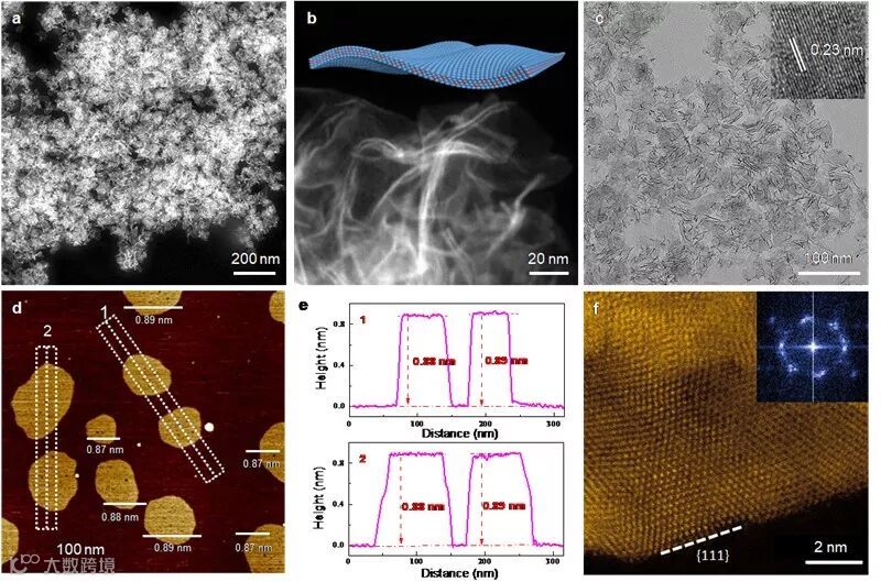 图1. 钯钼双金属烯的结构表征。(a-c)电子显微镜图片;(d, e)原子力显微镜图片及厚度分析;(f)球差透射电子显微镜图片