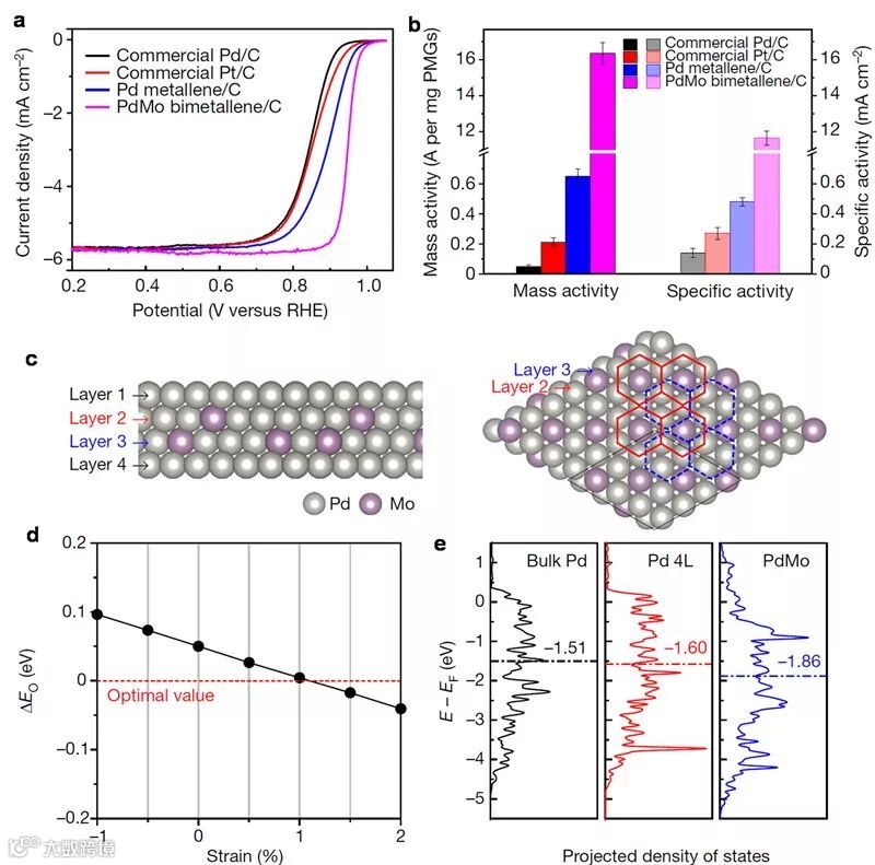 图2. 钯钼双金属烯的性能评价及催化机理研究。(a)各催化剂的ORR极化曲线及(b)活性对比图;(c)双金属烯的原子模型;(d)氧结合能与晶格应变的关系;(e)不同材料中Pd元素的d带中心位置