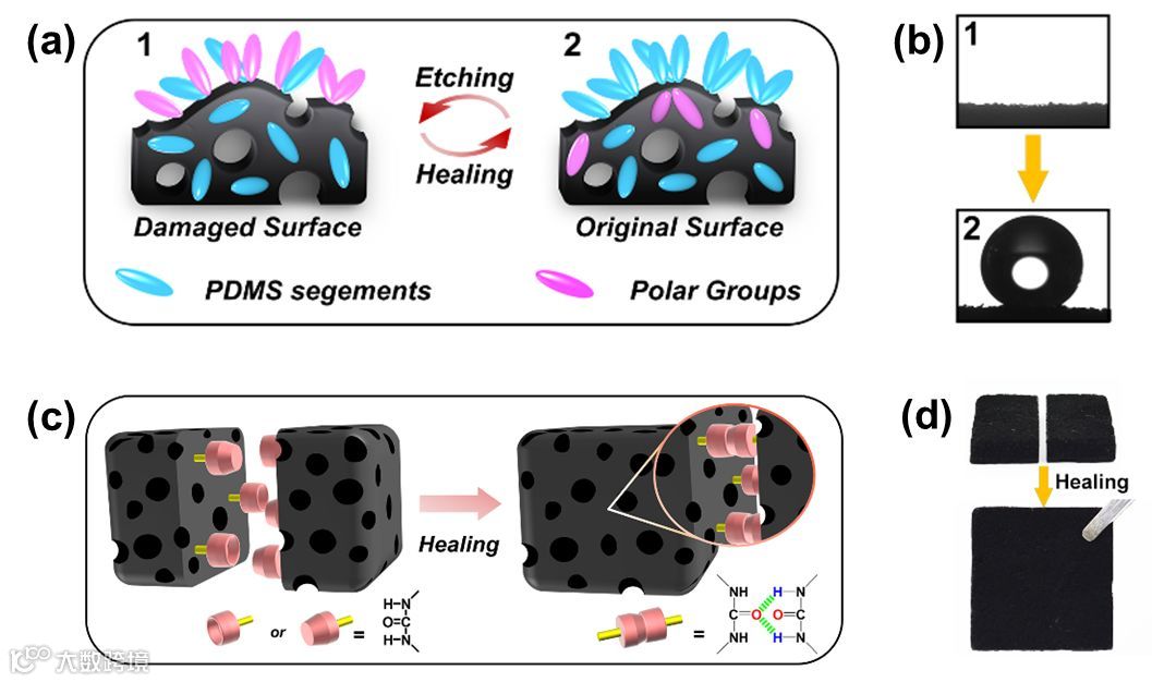 针对以上问题,吉林大学李洋副教授团队以氨基封端聚二甲基硅氧烷(NH2-PDMS-NH2)和异佛尔酮二异氰酸酯(IPDI)为原料合成了可室温自修复的疏水超分子聚合物PDMS-PUa(图1a)。随后将PDMS-PUa,多壁碳纳米管,氯化钠在四氢呋喃中混合,固化成型并除去盐模板,制备出多孔的自修复超疏水材料MCNTs/PDMS-PUa(图1b)。研究结果表明,MCNTs/PDMS-PUa具有良好的超疏水性能,化学稳定性和热稳定性。MCNTs/PDMS-PUa的静态接触角和滚动角分别为153.2°和5.6°,即使在1%的CH3COOH和Na2CO3溶液中浸泡12 h依然保持良好的超疏水性能;此外,在60 ℃条件下放置72 h,MCNTs/PDMS-PUa的多孔结构没有任何塌陷,接触角和滚动角也没有发生变化,保持初始的超疏水性能。